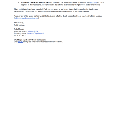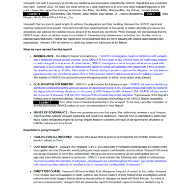 In the report recommendations I was disheartened to read, “GRACE recommends Vineyard USA, or other entity as appropriate within Vineyard’s governance structure, contract with an independent third party to investigate allegations of sexual assault that were made to GRACE and reported to Vineyard USA leadership. The allegations involved alleged victims and alleged perpetrators who were not a part of this investigation.” Robb, that’s plural. Victims. Perpetrators.
